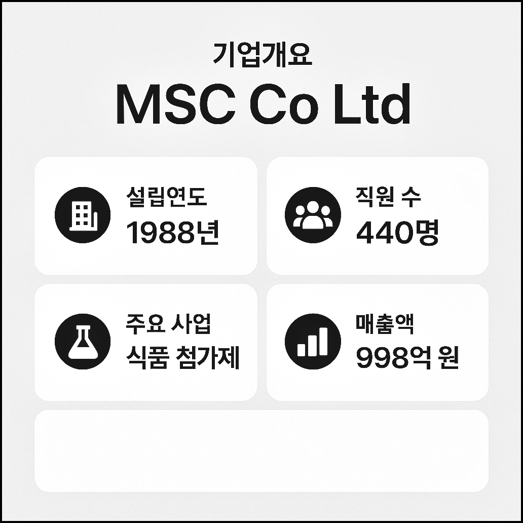 엠에스씨는 1988년에 설립된 코스닥 상장사로 주력 사업은 식품 첨가제 연구·개발·생산입니다.