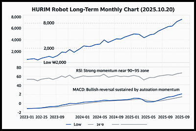 휴림로봇(090360) 주가 전망 보고서 — 2025년 10월작성일: 2025-10-20 · 작성자: 투자분석팀 · 태그: 휴림로봇로봇주스마트팩토리주가전망 핵심 요약: 2025-10-20 정부의 AI·로봇 대규모 투자 발표 소식으로 휴림로봇(090360)이 상한가(5,980원, +29.86%)를 기록했습니다. 단기적 모멘텀은 강하지만, 변동성 확대에 유의해야 합니다.목차기업 개요와 투자 매력장기 차트 분석중기 차트 분석단기 차트 분석 & 매매 전략향후 전망: 기회와 리스크1️⃣ 휴림로봇(090360) 기업 개요와 투자 매력회사명: 휴림로봇(Hureem Robot Co., Ltd.) · 티커: 090360 (코스닥)설립연도: 2002년 · 직원수: 약 150명(추정) · 시가총액: 약 1,500억 원 수준..