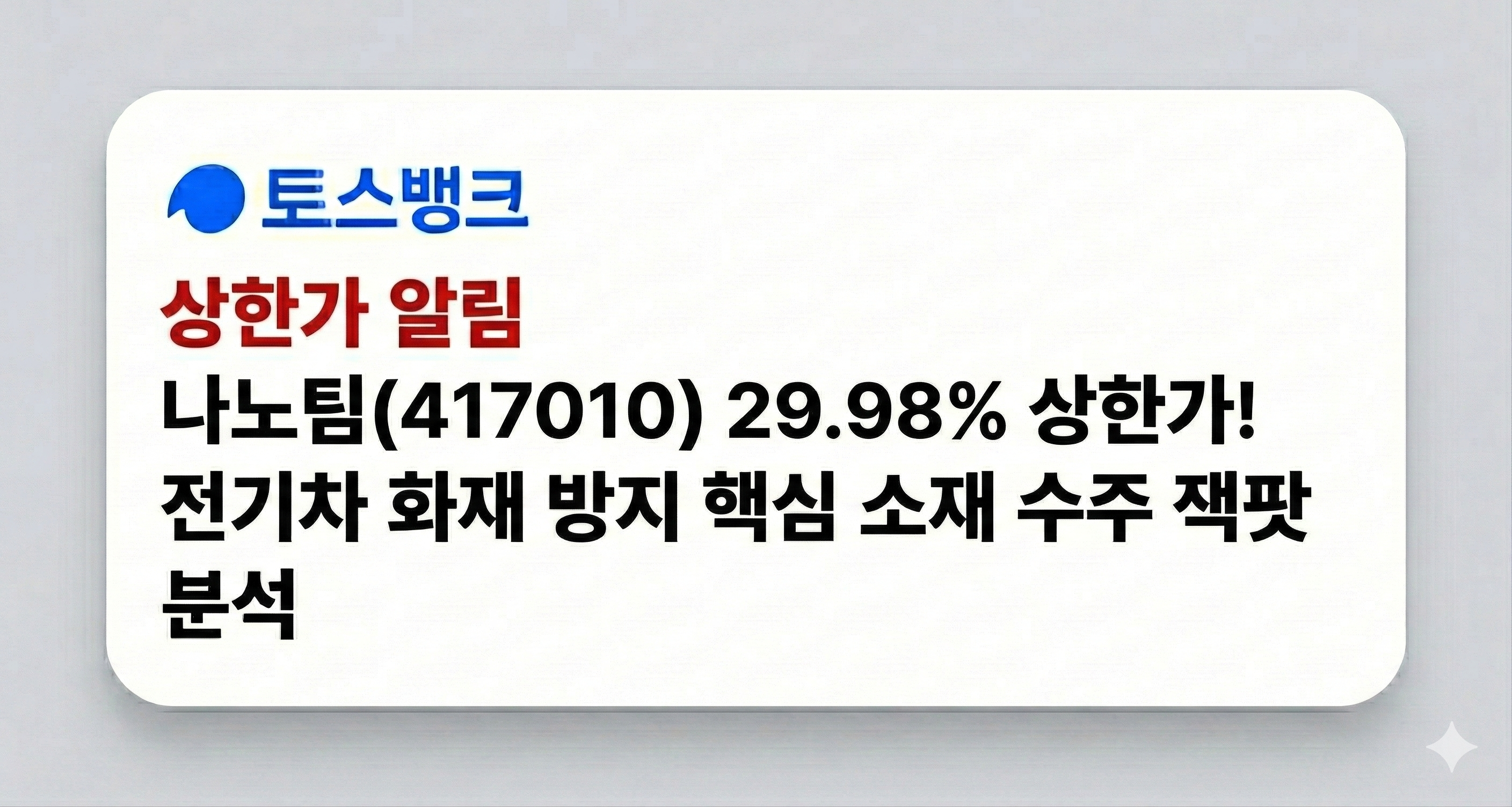 🚀 나노팀(417010) 29.98% 상한가! 전기차 화재 방지 핵심 소재 수주 잭팟 분석 1. 나노팀 주가 현황: 이차전지 안전 테마의 새로운 대장주 등극 안녕하세요. 이차전지 밸류체인 내 고성장 핵심 소재주를 정밀 분석하는 '투자일기'입니다. 🚀 오늘 코스닥 시장에서 **나노팀(417010)**이 전일 대비 **1,880원(+29.98%)** 상승하며 **8,150원** 상한가에 안착했습니다. 나노팀의 이번 상한가는 단순한 반등을 넘어선 **'실적 성장의 가시화'** 때문입니다. 전기차 배터리의 열폭주를 막는 방염 패드와 열관리 소재(Gap Filler)에 대한 글로벌 완성차(OEM)들의 러브콜이 이어지며, 역대급 수주 잔고를 확보했다는 소식이 전해졌습니다. 특히 시간외종가거..