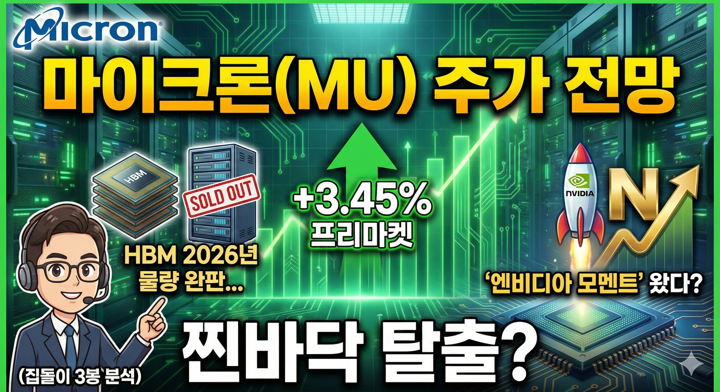 🚀 마이크론(MU) 프리마켓 +3.45%! HBM 2026년 물량 완판... '엔비디아 모멘트' 왔다? (집돌이 3봉 분석) 메모리 반도체의 자존심 마이크론 테크놀로지(MU)가 2026년 새해 벽두부터 광폭 행보를 보이고 있습니다! 현재 프리마켓에서 +$10.91(+3.45%) 추가 상승하며 $326.33 (약 470,600원)를 기록 중입니다. 52주 신고가를 갈아치우며 $350 고지를 향해 진격하는 이 시점, 과연 '역대급 랠리'의 정점일까요? I. 오늘 왜 올랐을까? (두 가지 핵심 이유)1. 2026년 HBM 공급 '완판' 및 공급자 우위 시장 확고 마이크론은 최근 실적 발표를 통해 2025년은 물론, 2026년 생산 예정인 HBM 물량까지 이미 전량 선주문 계약이 완료되었..